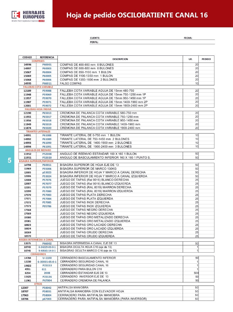 HOJA DE PEDIDO CANAL 16 T&T - HERRAJES PARA ALUMINIO CANAL 16, MANILLAS CON Y SIN LLAVE, DISTRIBUIDOR PARA T&T Y WINK HAUS